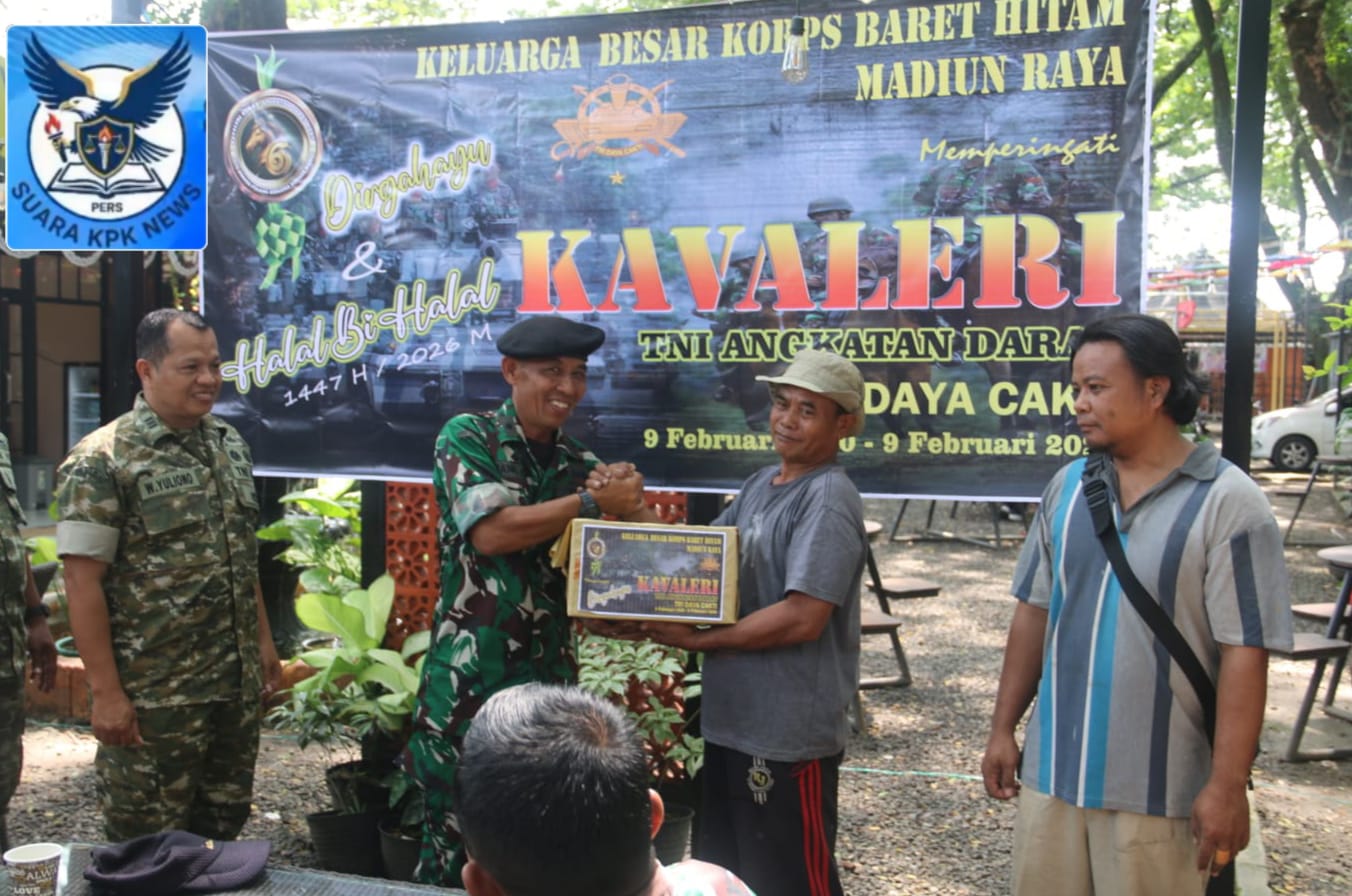 Madiun.Suara KPK News.com// Prajurit Korps Kavaleri TNI AD di Madiun Raya memberikan bansos kepada masyarakat kurang mampu pada acara peringatan HUT ke-76 Kavaleri TNI AD sekaligus Halalbihal yang digelar di Ngrowo Bening Edu Park, Kota Madiun, Rabu (15/6/2026). Para prajurit tersebut berasal dari berbagai satuan di jajaran Korem 081/DSJ dan Secata Rindam V/Brawijaya.